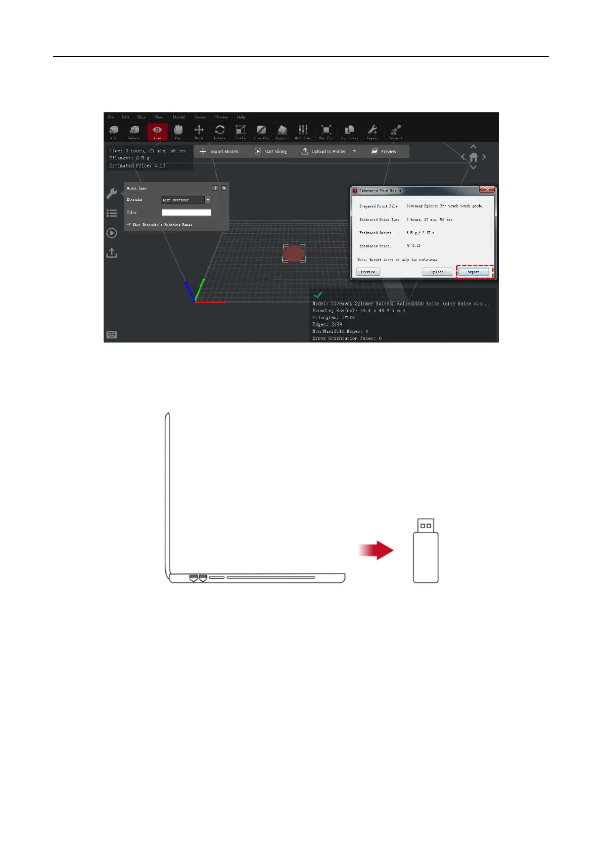Save the sliced files (.gcode and .data) by exporting them to the included USB storage device.