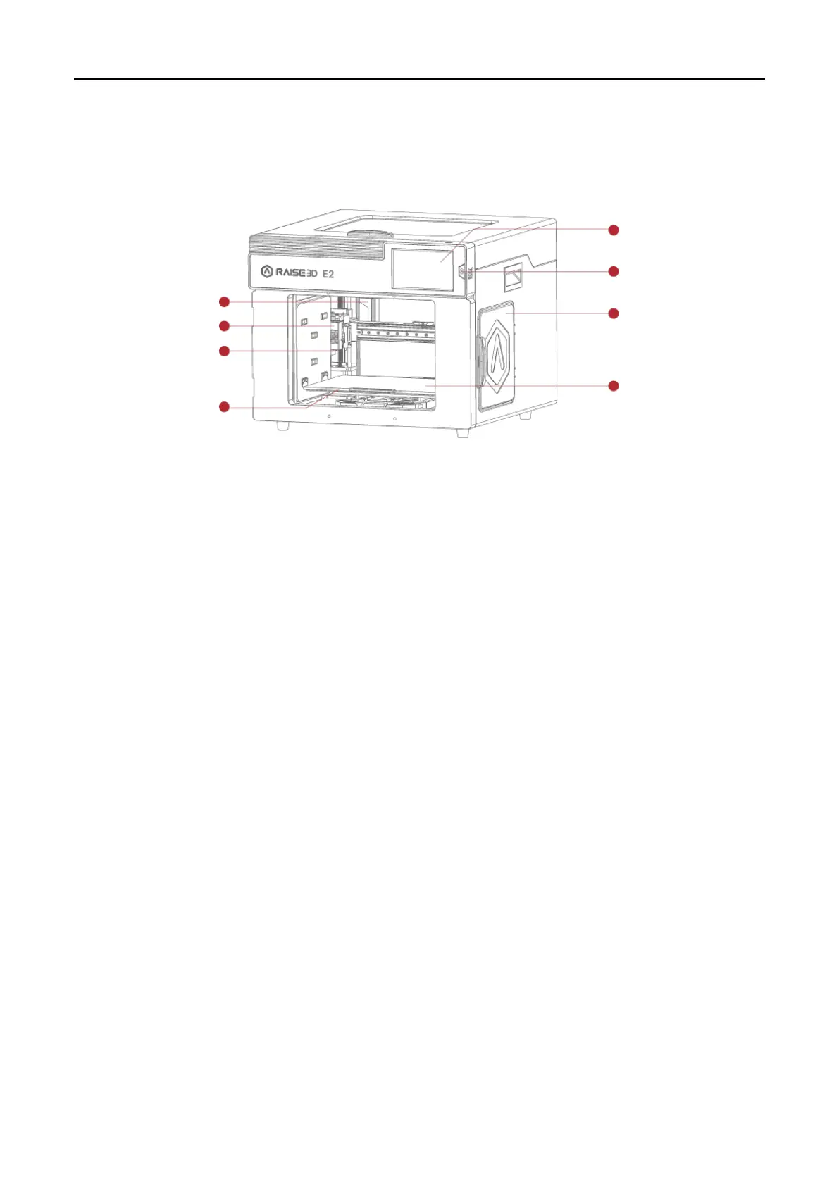 Raise3D E2 - Printer Components: Front View Details; Air Filter and Filament Box; Extruder and Hotend; Platform Tray and Flexible Plate