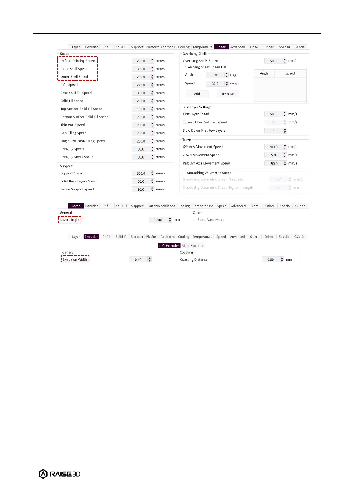 3) In ideaMaker, Raise3D filaments have threshold limits for speed, acceleration, and