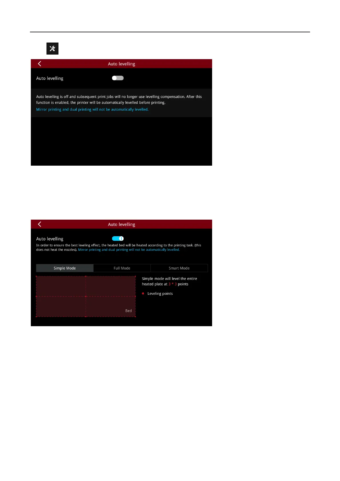 Simple mode: In Simple Mode, the printer will flatten the whole printing plate by 9 points before each