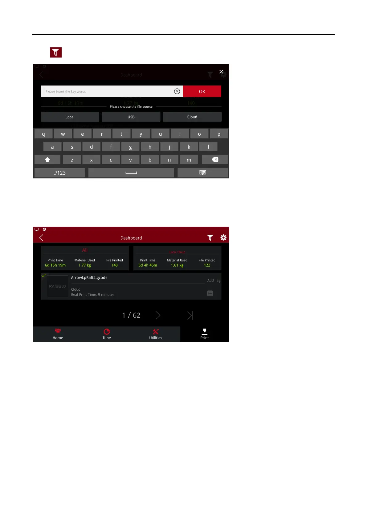 You can filter printing task records by clicking on the “Cloud”, “Local Storage”, “USB” according to