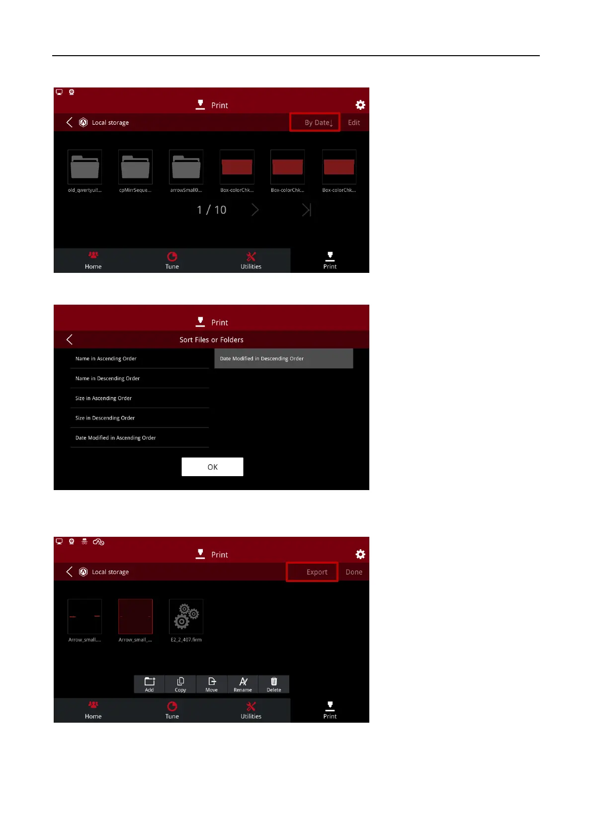 File Sort: click the sort button in the upper right corner to sort the printed files in the following ways.