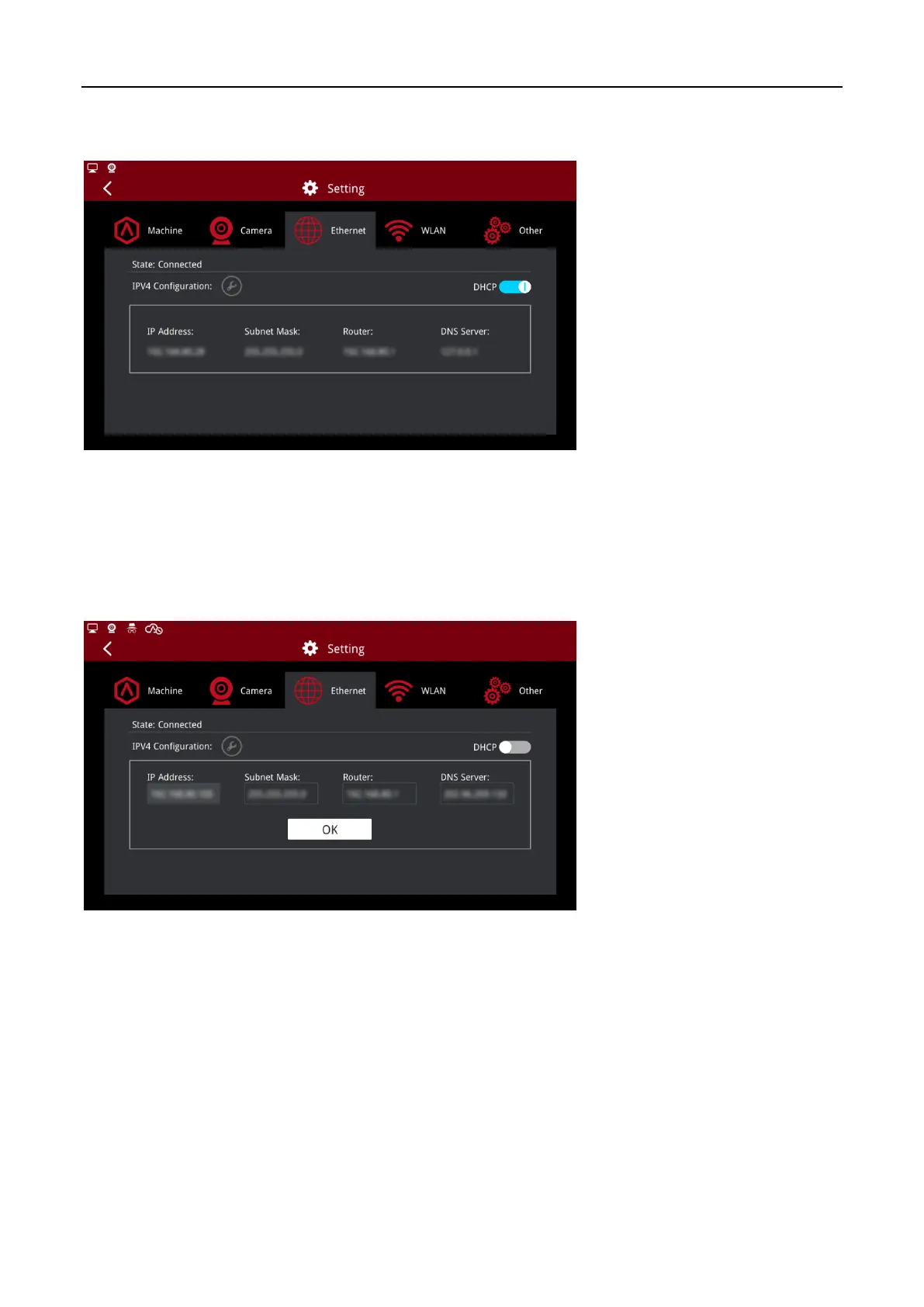 To set the detail information such as IP address, disable the DHCP. Input the information and press OK