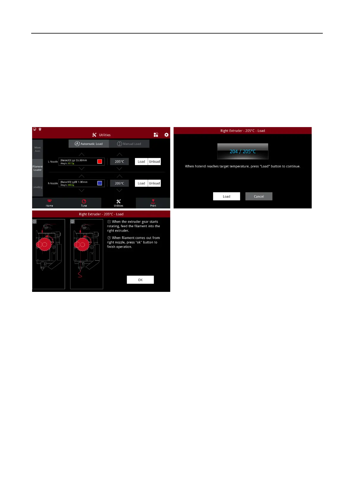 Before you print for the first time, please load the filaments. Taking the left nozzle as an example, click