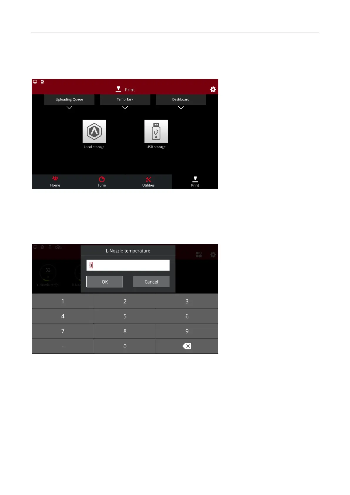 When you want to start a print, open “Print” page, choose a file in Local storage or plug in a USB
