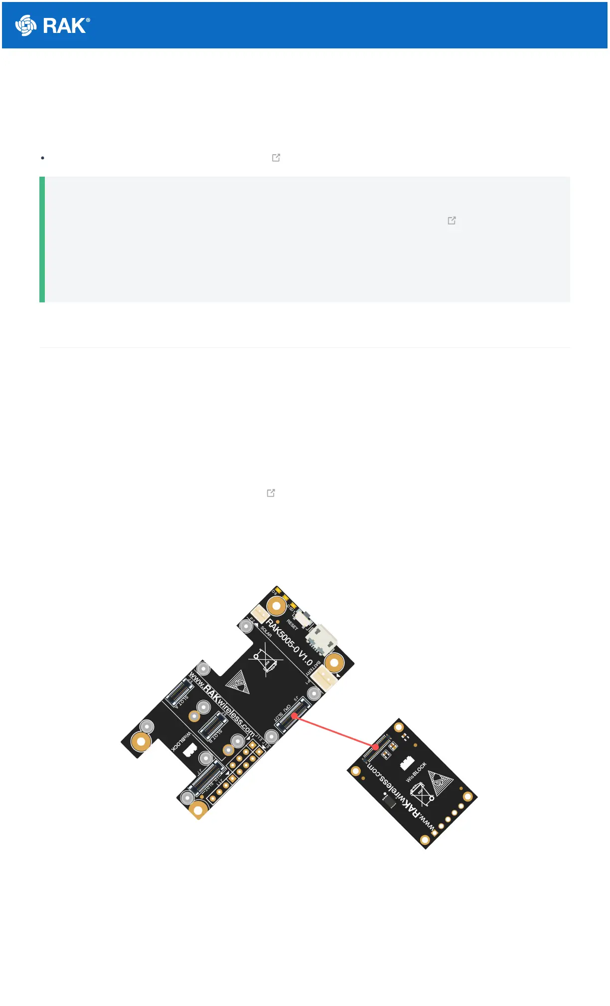 To illustrate, RAK4631 can be connected to RAK5005-O WisBlock Base, as shown in Figure 1.