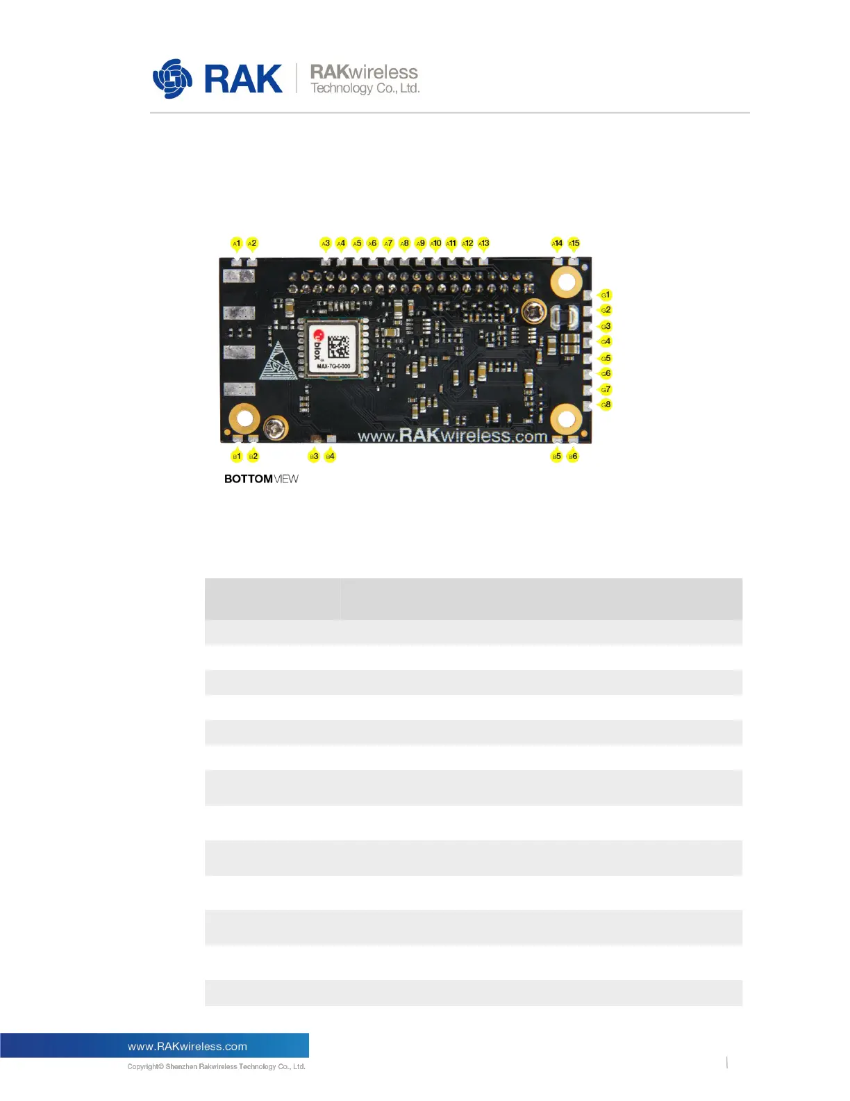 The RAK2245 provides PINs at the bottom side. The description of the pins is given by