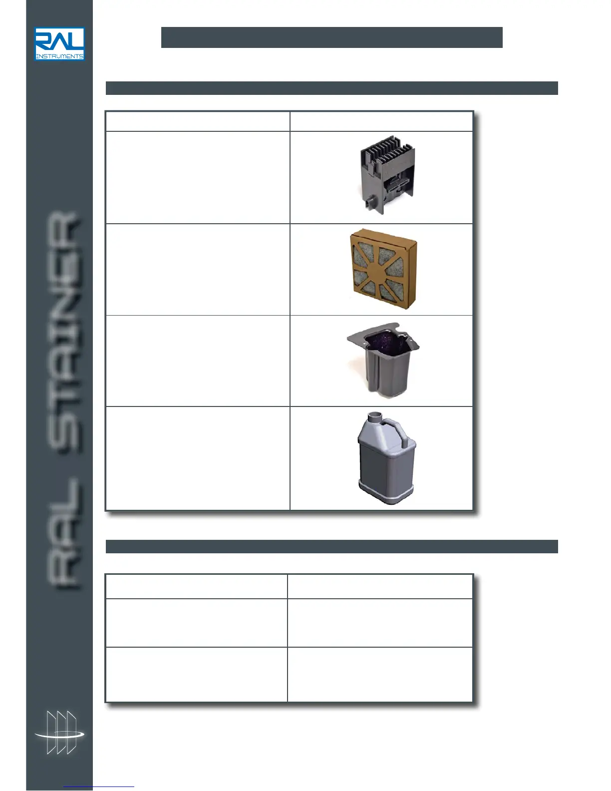 RAL instruments STAINER - 13 CONSUMABLES AND OPTION EQUIPMENT; 13.1 CONSUMABLES; 13.2 OPTIONAL EQUIPMENT