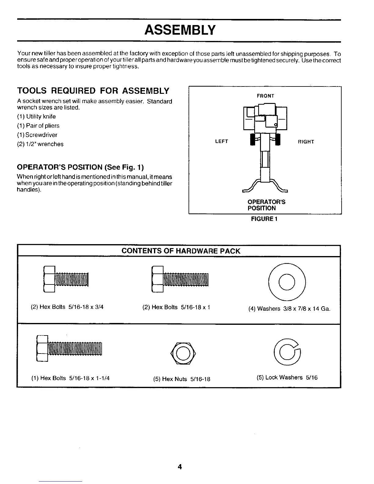 ensure safe and prope roperation of your tiller all parts and hardware you assemble must be tightened securely. Use the correct