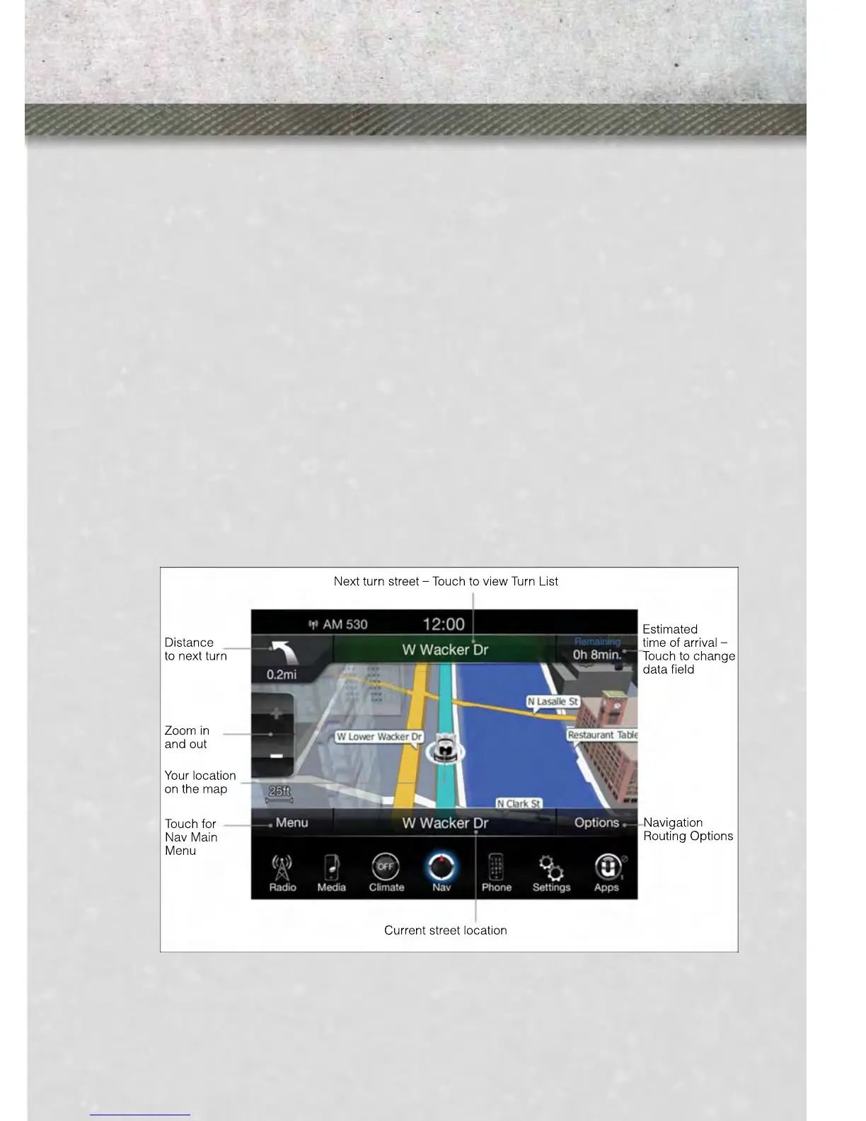 • Touch the “Nav” soft-key in the menu bar to access the Navigation system and the