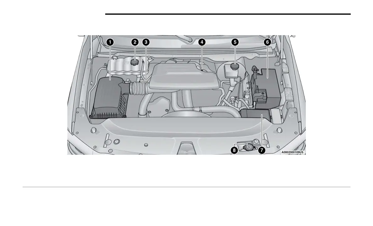 4 — Engine Oil Fill 8 — Washer Fluid Reservoir Cap