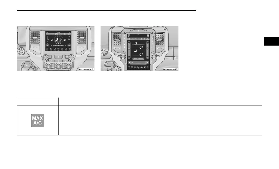 Press and release the MAX A/C button on the touchscreen to change the current setting to the coldest output of air. The