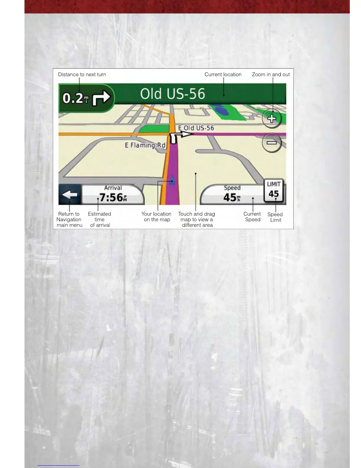 • Your route is marked with a magenta line on the map. If you depart from the
