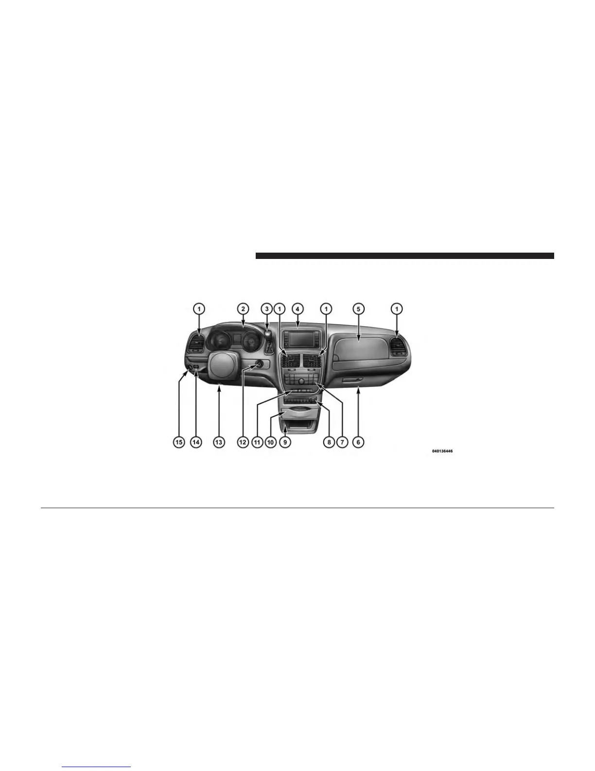 1 — Air Vents 5 — Upper Glove Compartment 9 — Storage Bin 13 — Hood Release
