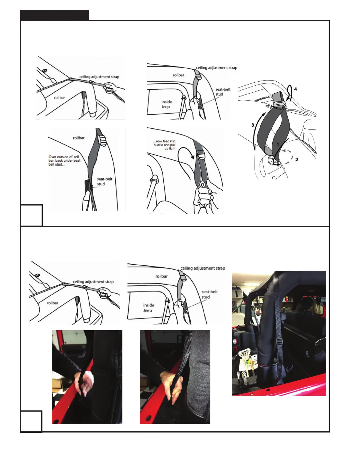 4-Door Model ONLY Locate the ceiling adjustment straps at the corners of the ceiling panel. Wrap the straps around the roll bar and