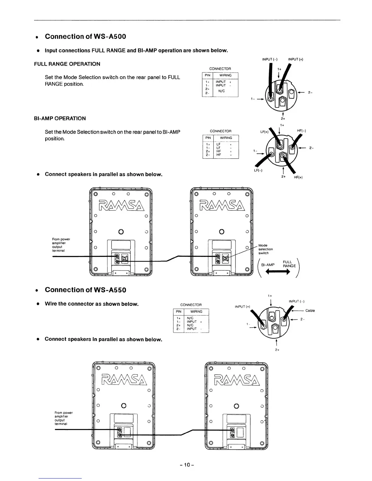 Ramsa WS-A500-W - WS-A500 Connections; Full Range Operation; Bi-Amp Operation; WS-A550 Connections
