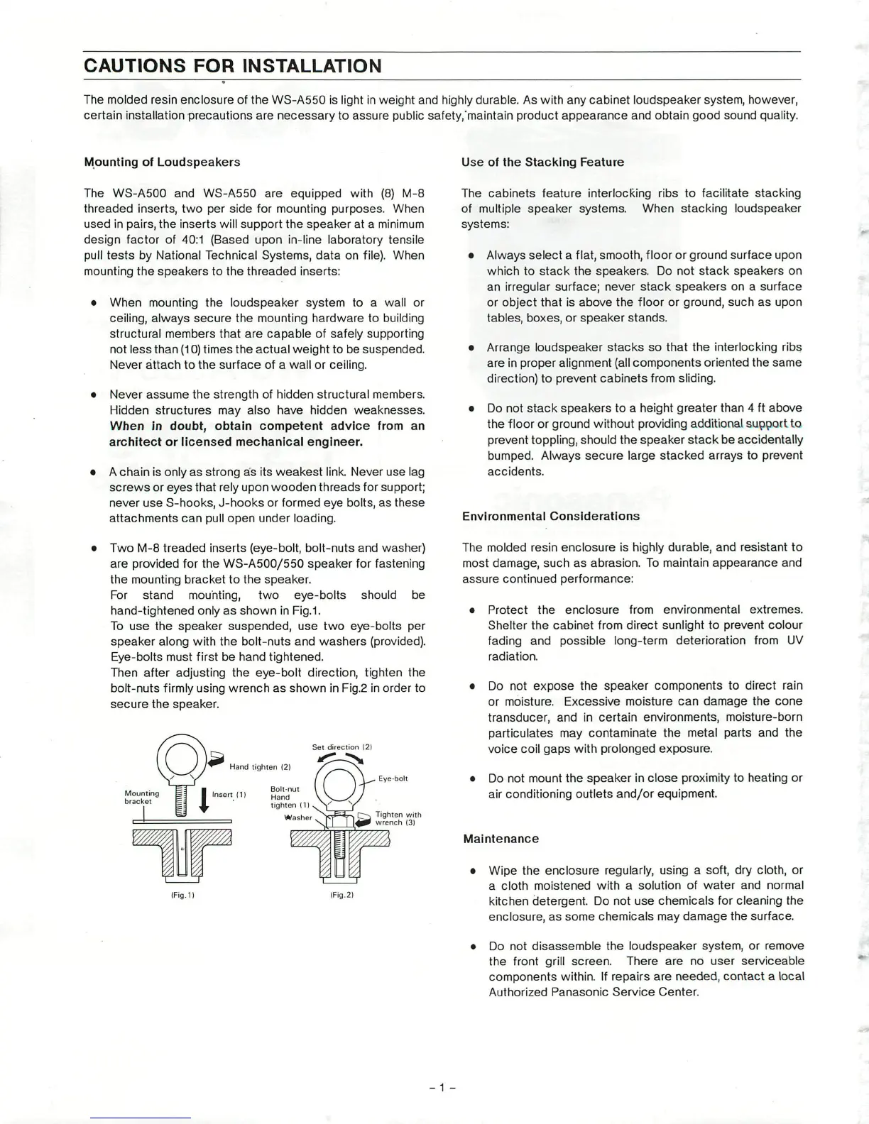 certain installation precautions are necessary to assure public safety/maintain product appearance and obtain good sound quality.