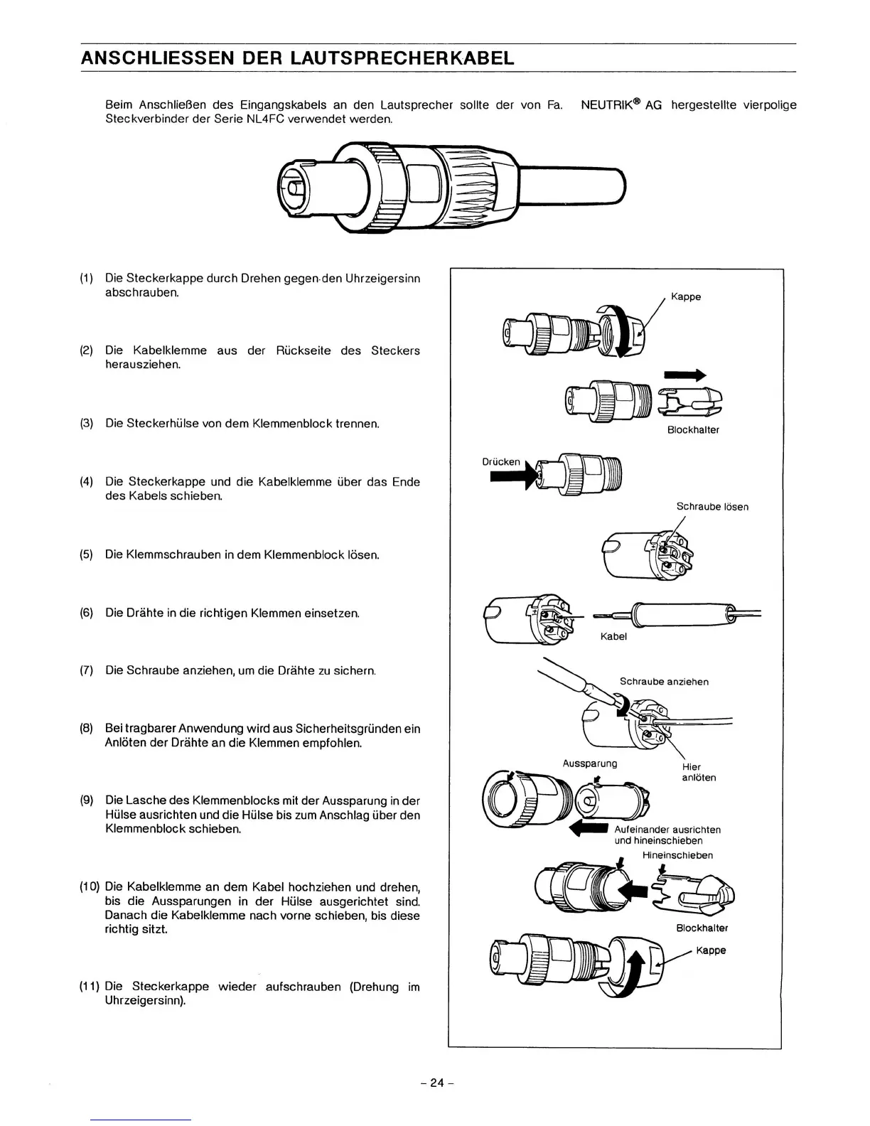 Beim Anschließen des Eingangskabels an den Lautsprecher sollte der von Fa. NEUTRIK® AG hergestellte vierpolige