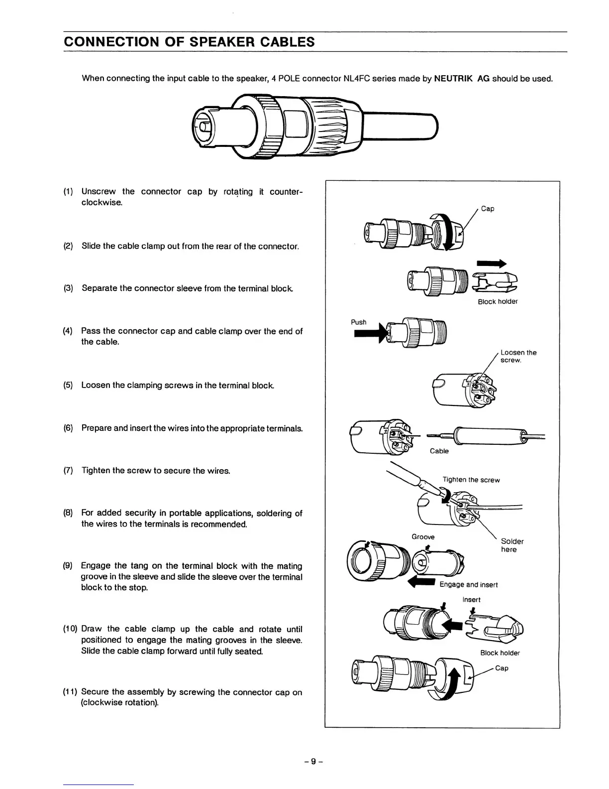 When connecting the input cable to the speaker, 4 POLE connector NL4FC series made by NEUTRIK AG should be used.