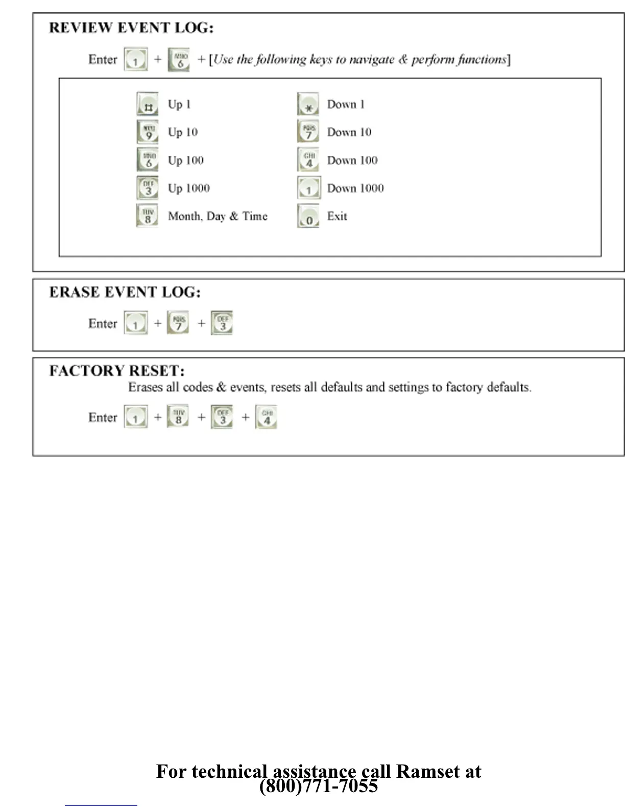 RAMSET LCD-KP - LOGS AND RESET FUNCTIONS; FACTORY RESET