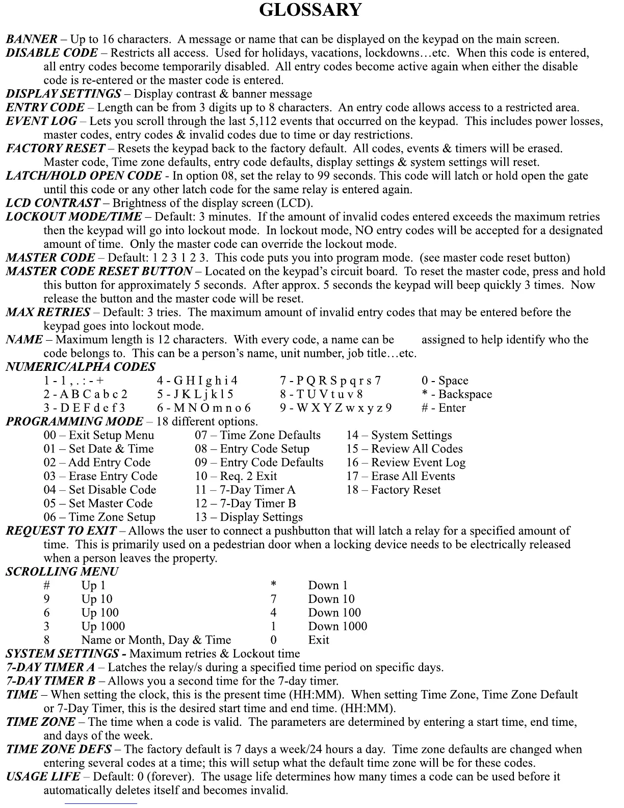 DISABLE CODE – Restricts all access. Used for holidays, vacations, lockdowns…etc. When this code is entered,