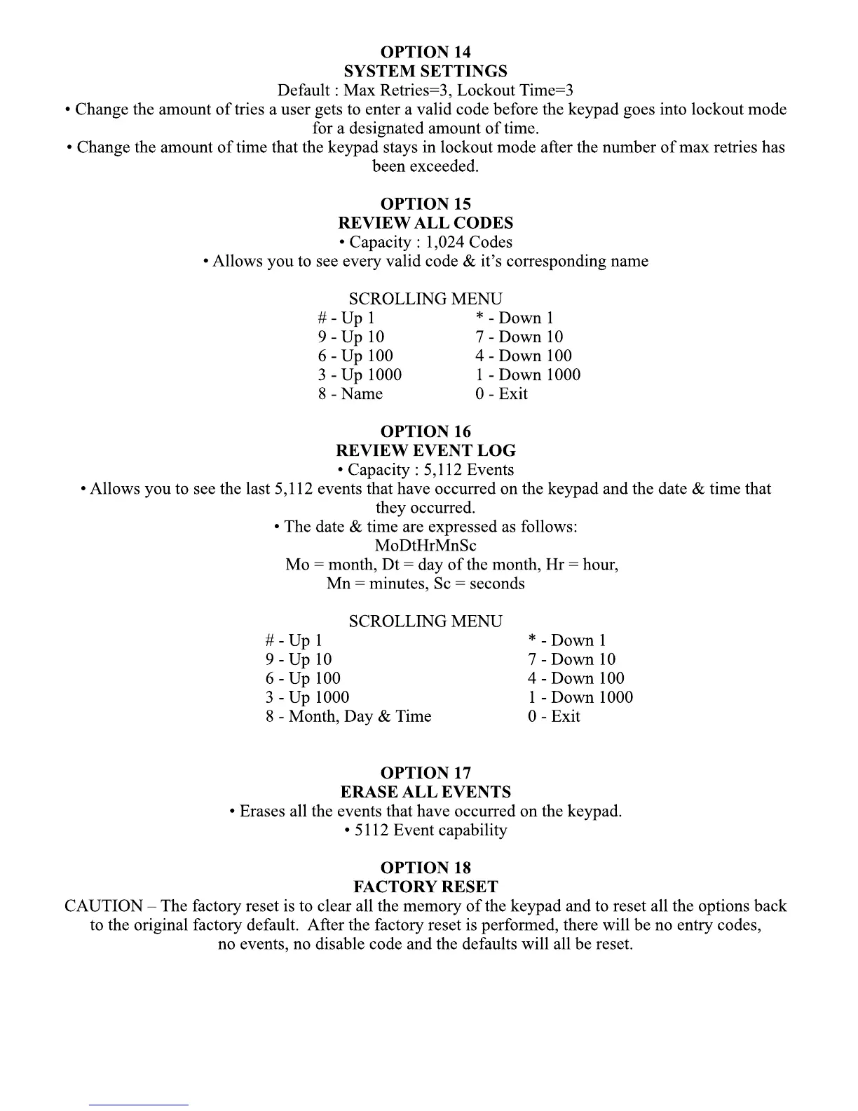 CAUTION – The factory reset is to clear all the memory of the keypad and to reset all the options back