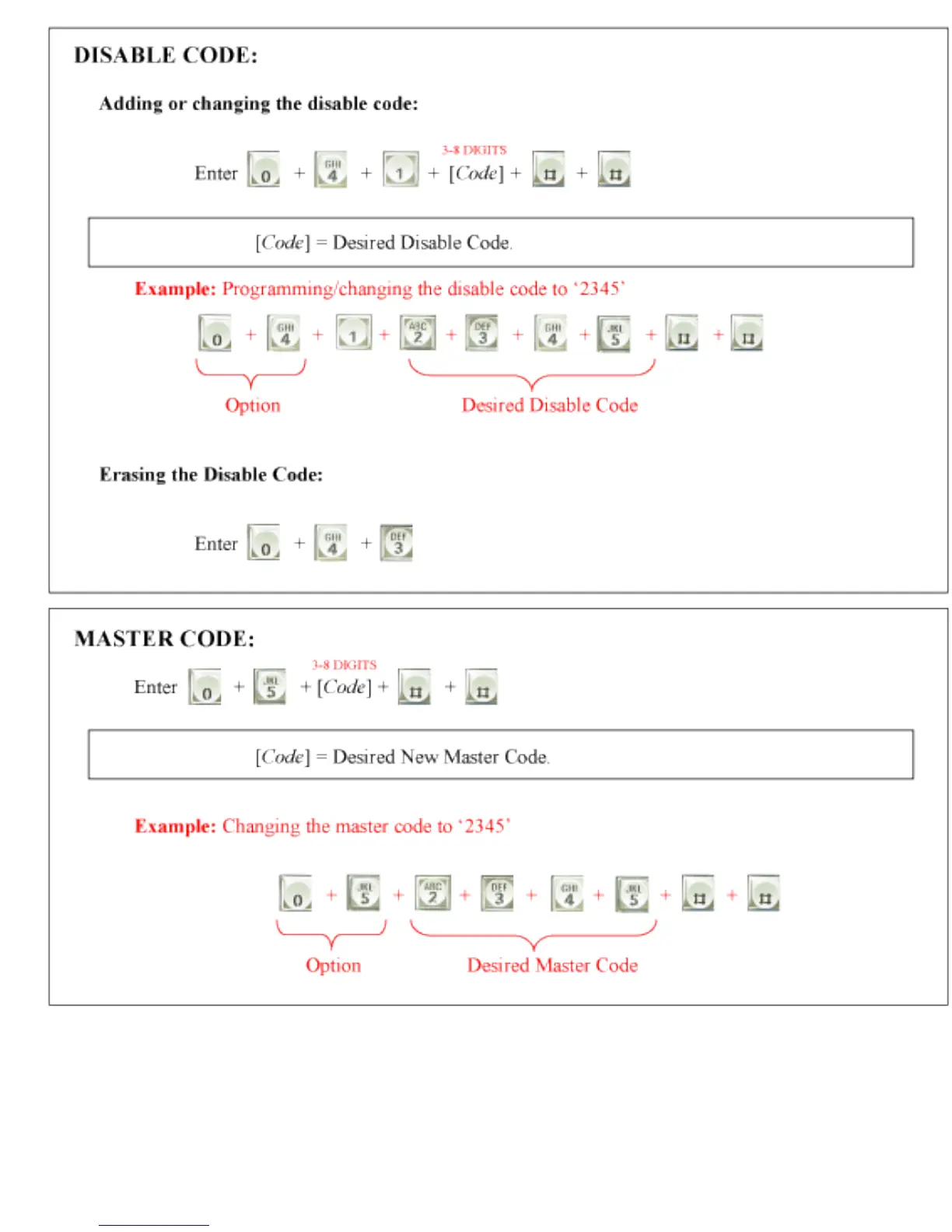 RAMSET LCD-KP - SECURITY CODE CONFIGURATION; DISABLE CODE; MASTER CODE