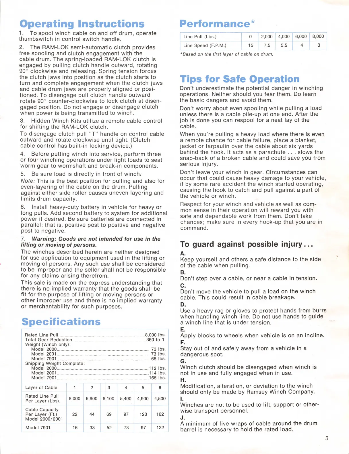 Ramsey Electronics 2000 - Operating Instructions; Spooling Cable; RAM-LOK Clutch Operation; Initial Winching Operations