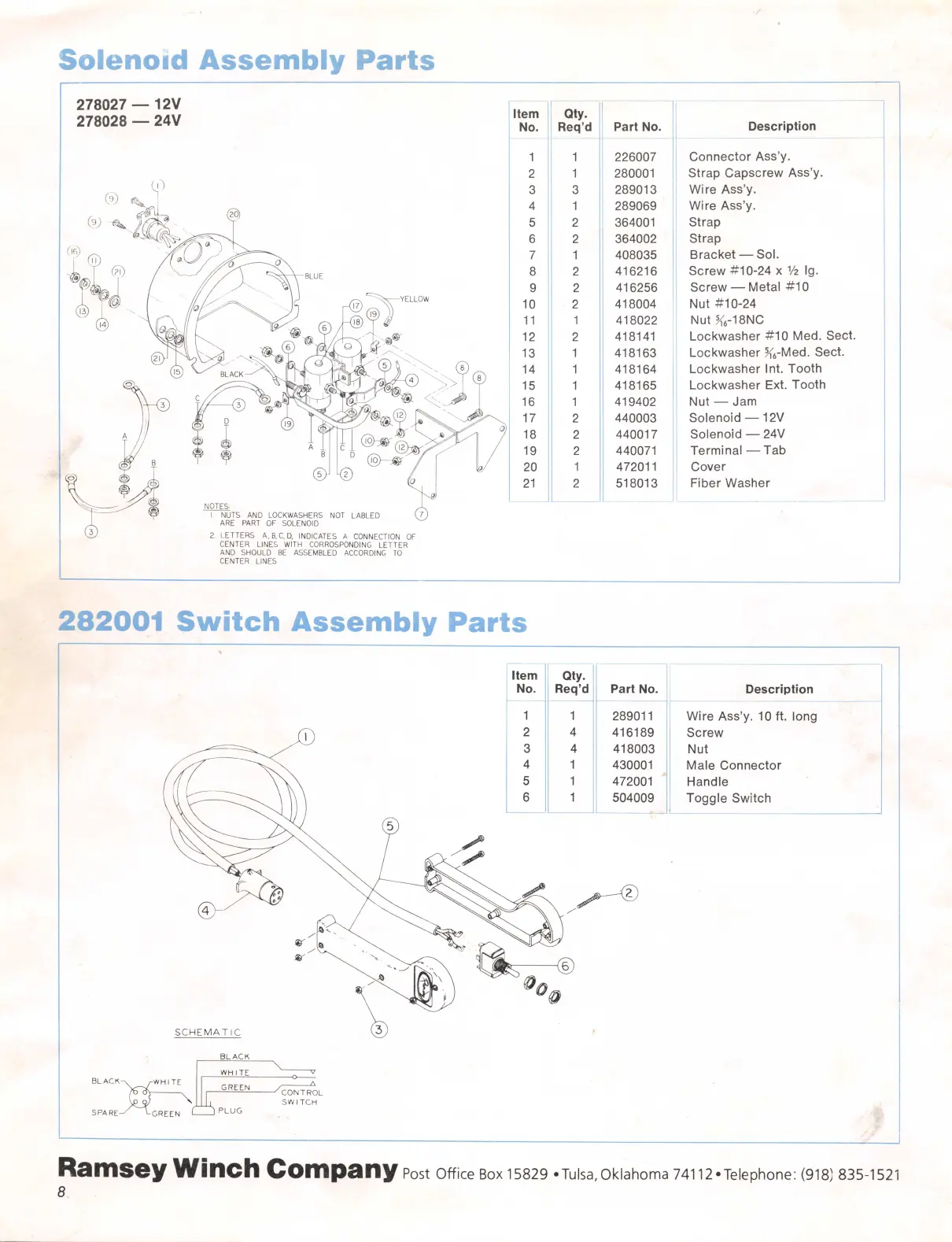 Ramsey Electronics 2000 - Solenoid Assembly Parts; Switch Assembly Parts
