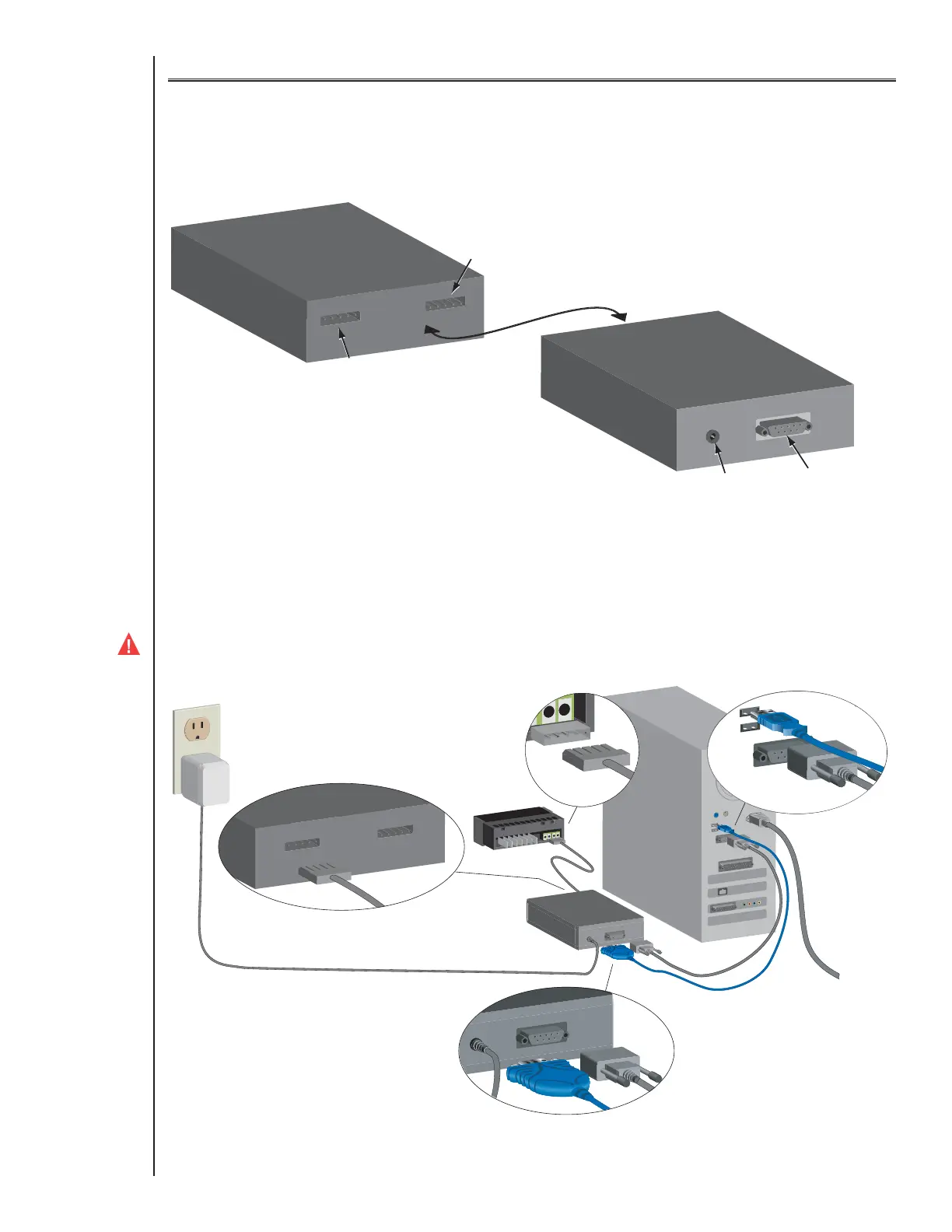 Connect the interface box to the computer using either the RS232 db9 serial cable OR the USB to RS232 db9 converter cable (shown in blue below).