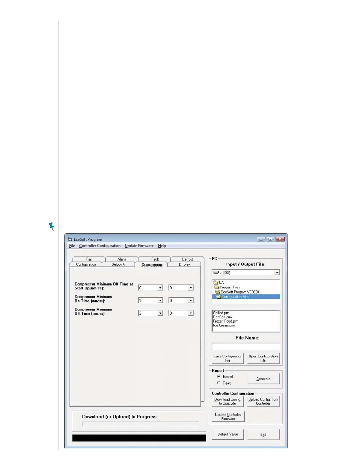 Use the Compressor tab to set compressor protection delays for the minimum power on and power off periods for the compressor. These minimum time