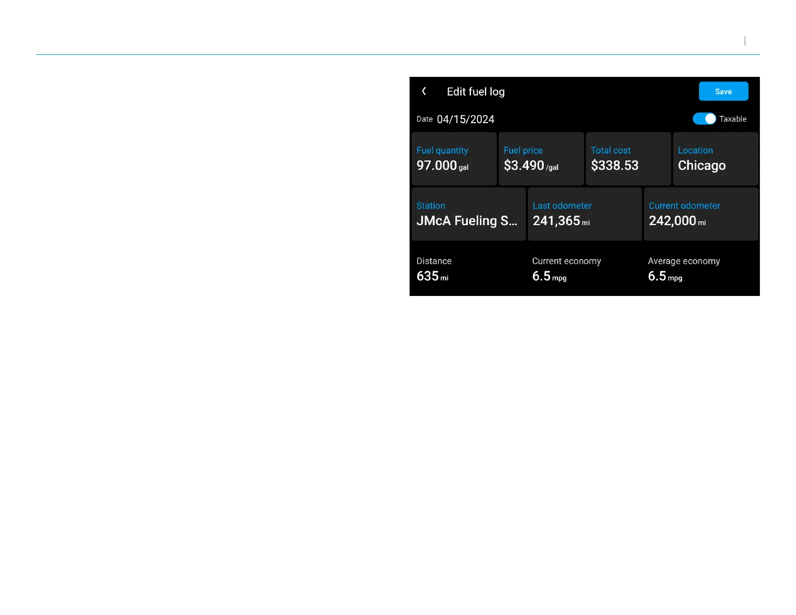 3. Tap Save to record a fuel purchase.