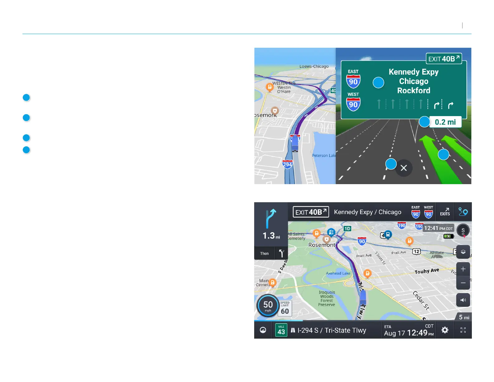 Signs to follow for the next maneuver. Includes exit number and