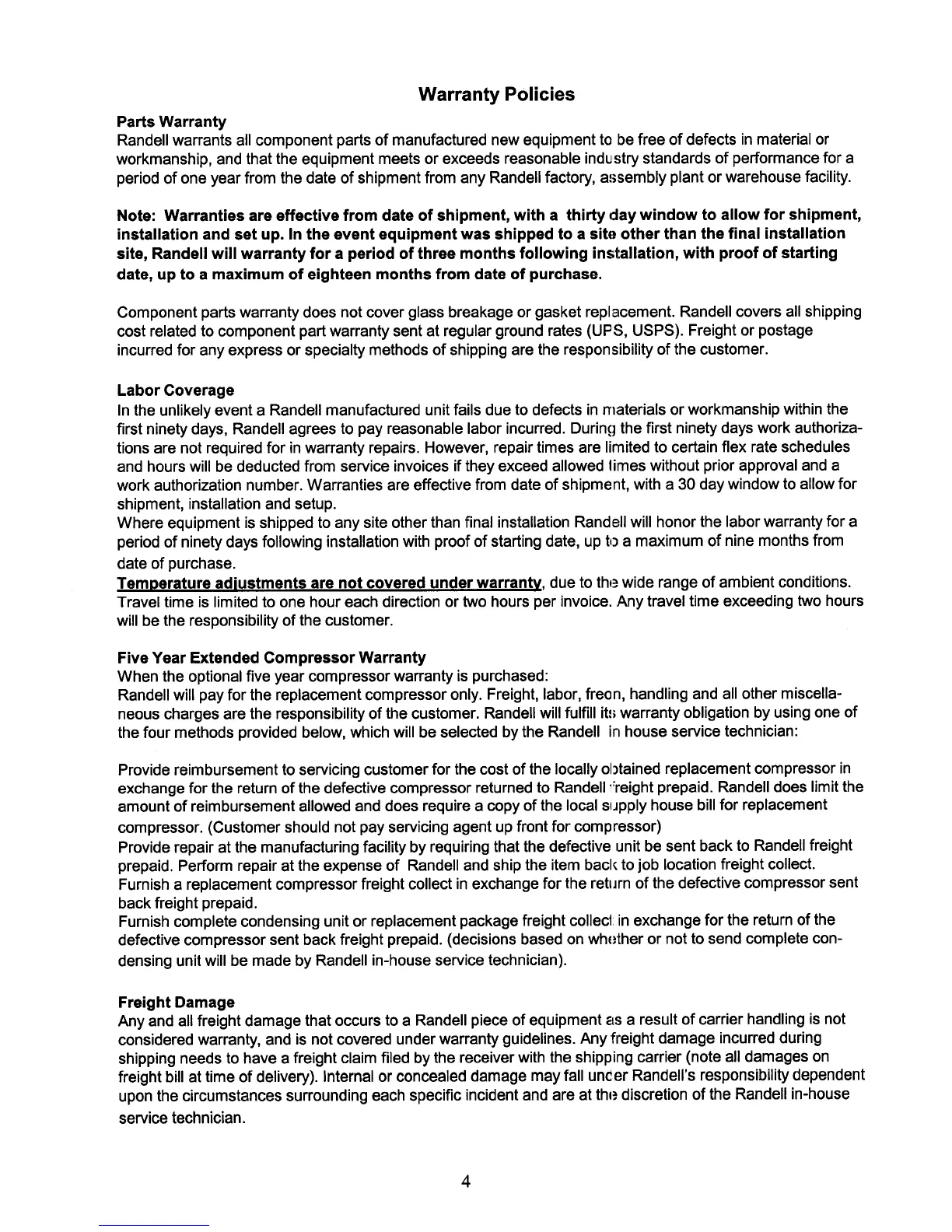 Randell 9030K-7 - Warranty Policies; Parts Warranty; Labor Coverage; Freight Damage