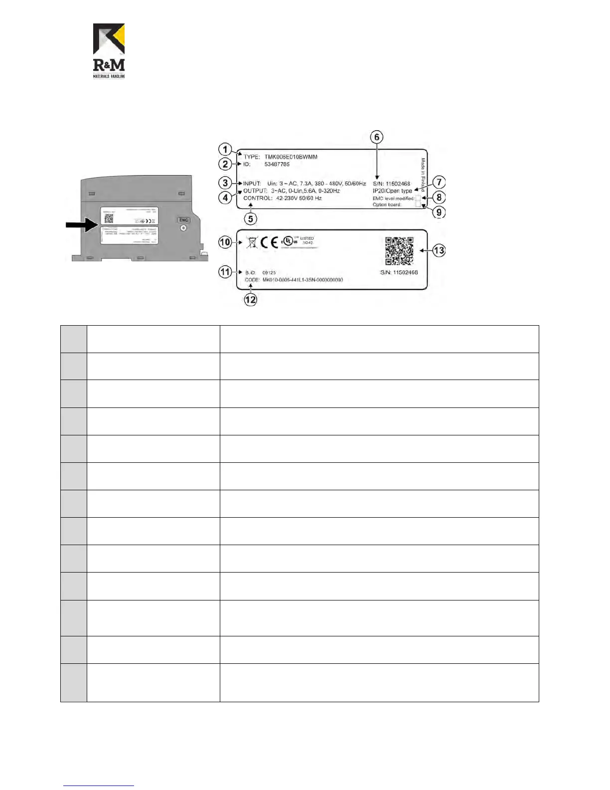 The main sticker shows, for example, the model and serial number of the frequency converter, as well as the rated