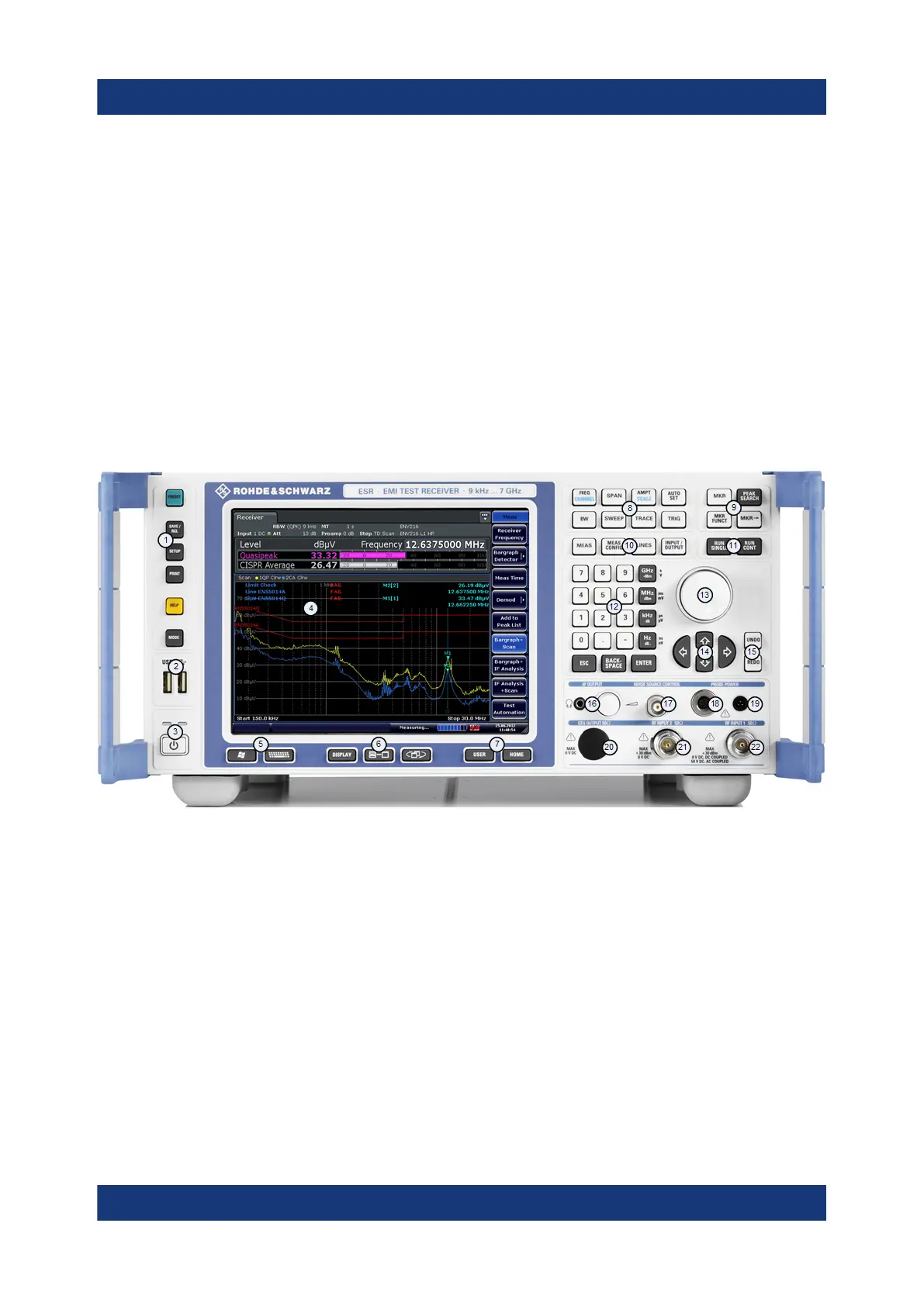 The front panel of the R&S ESR is shown in Figure 4-1. Each element (function