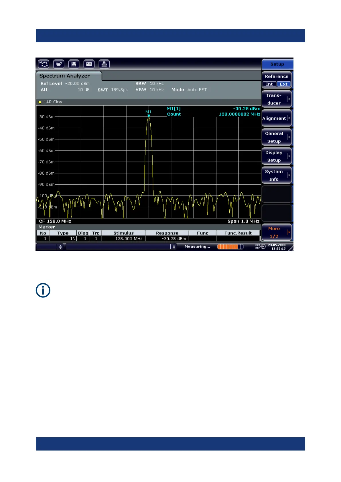 In the following example, the generator signal with 128 MHz and -20 dBm is used