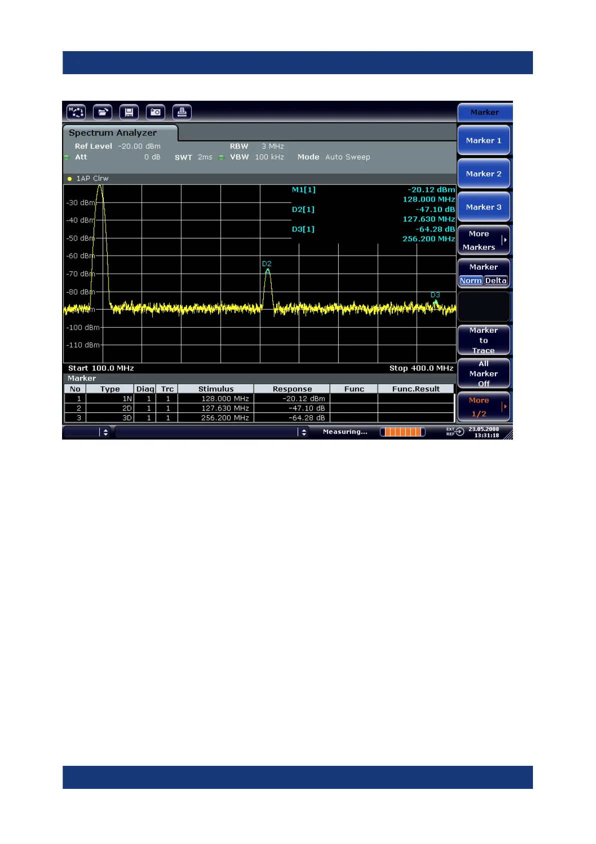 Delta markers D2 [1] and D3 [1] show the offset of the first and second harmonics