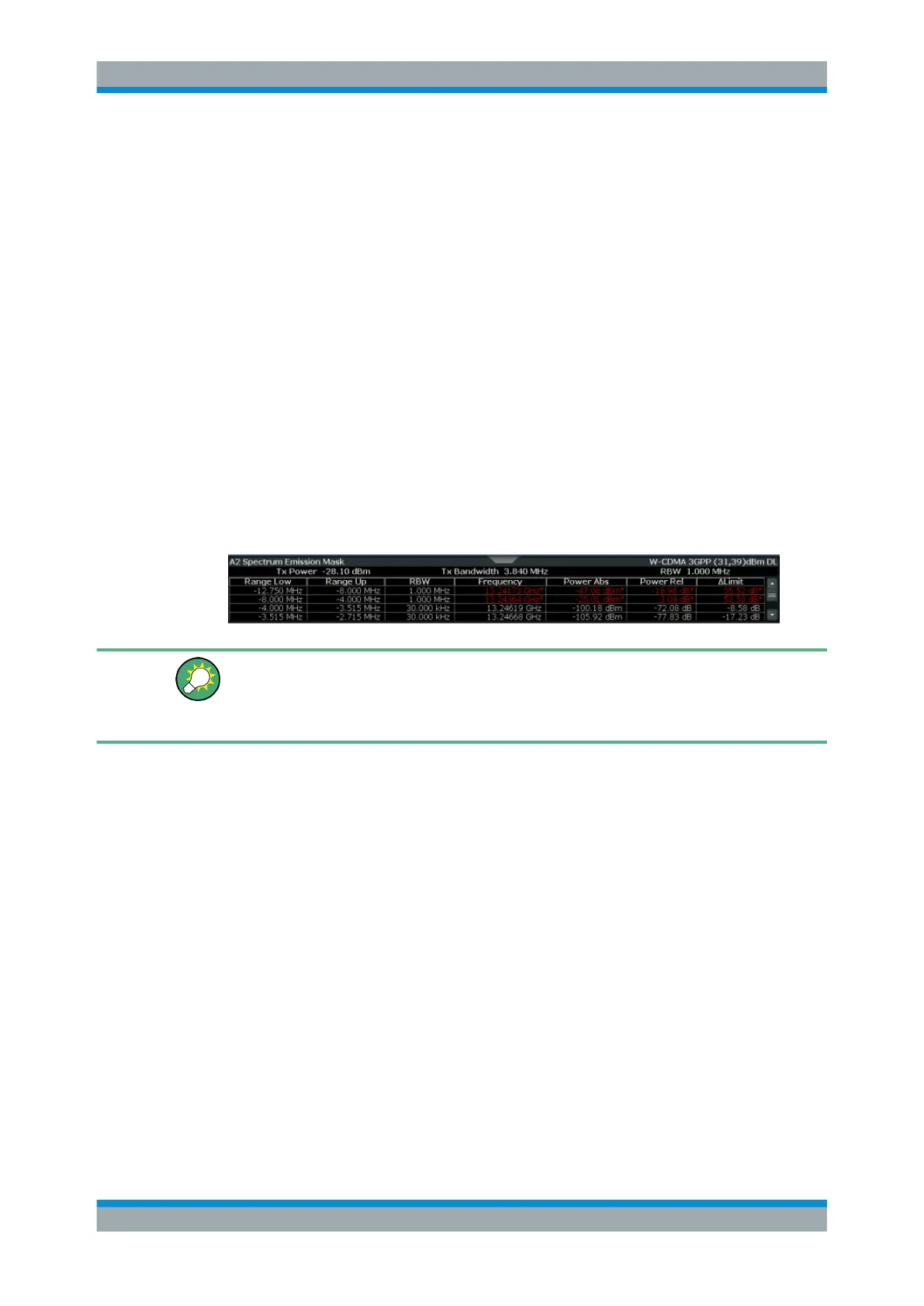 peaks from the TX channel power are displayed. Values that exceed the limit are indi-