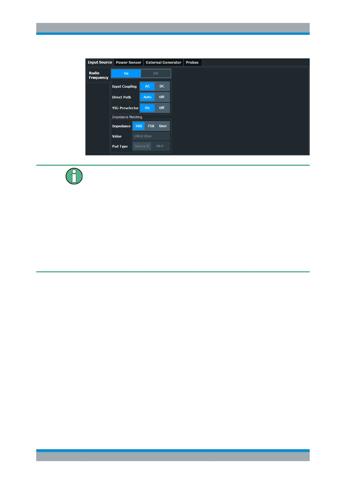 The RF input of the R&S FSV/A can be coupled by alternating current (AC) or direct