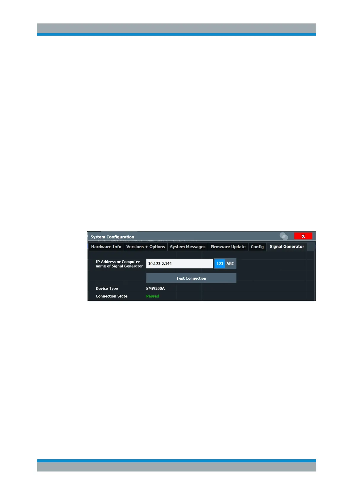 The IP address or computer name of the signal generator connected to the