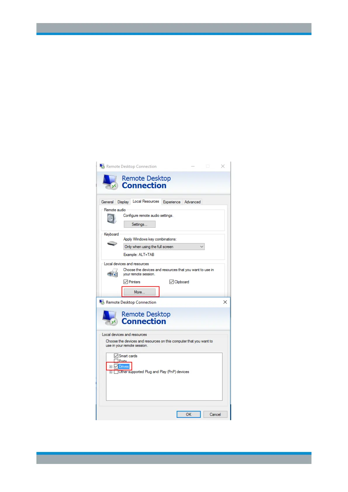 7. Open the "Local Resources" tab for enabling printers, local drives and serial inter-