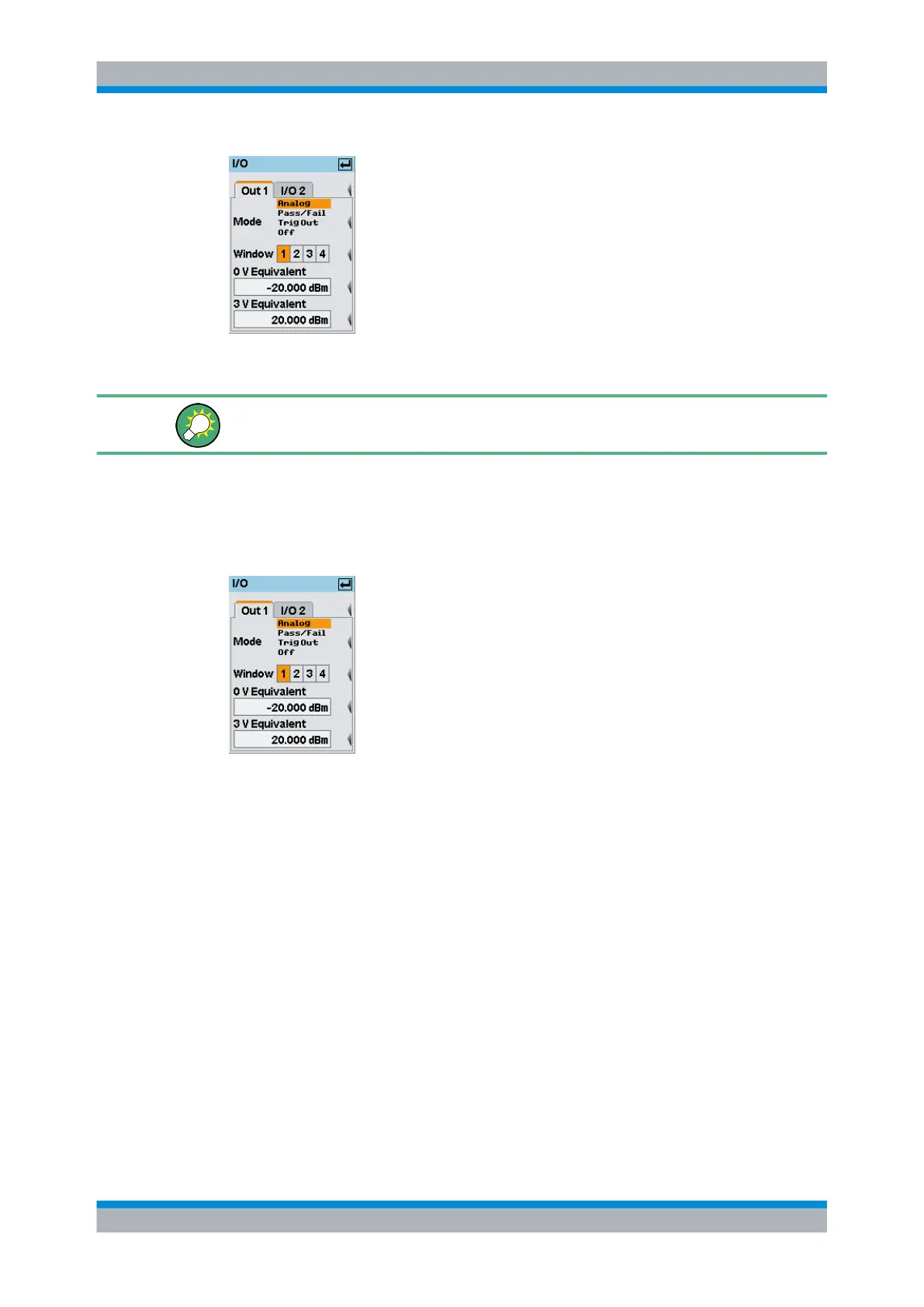 Selects the function of the "OUT1 / TRIG OUT" connector. "Analog", "Pass/Fail", "Trig-