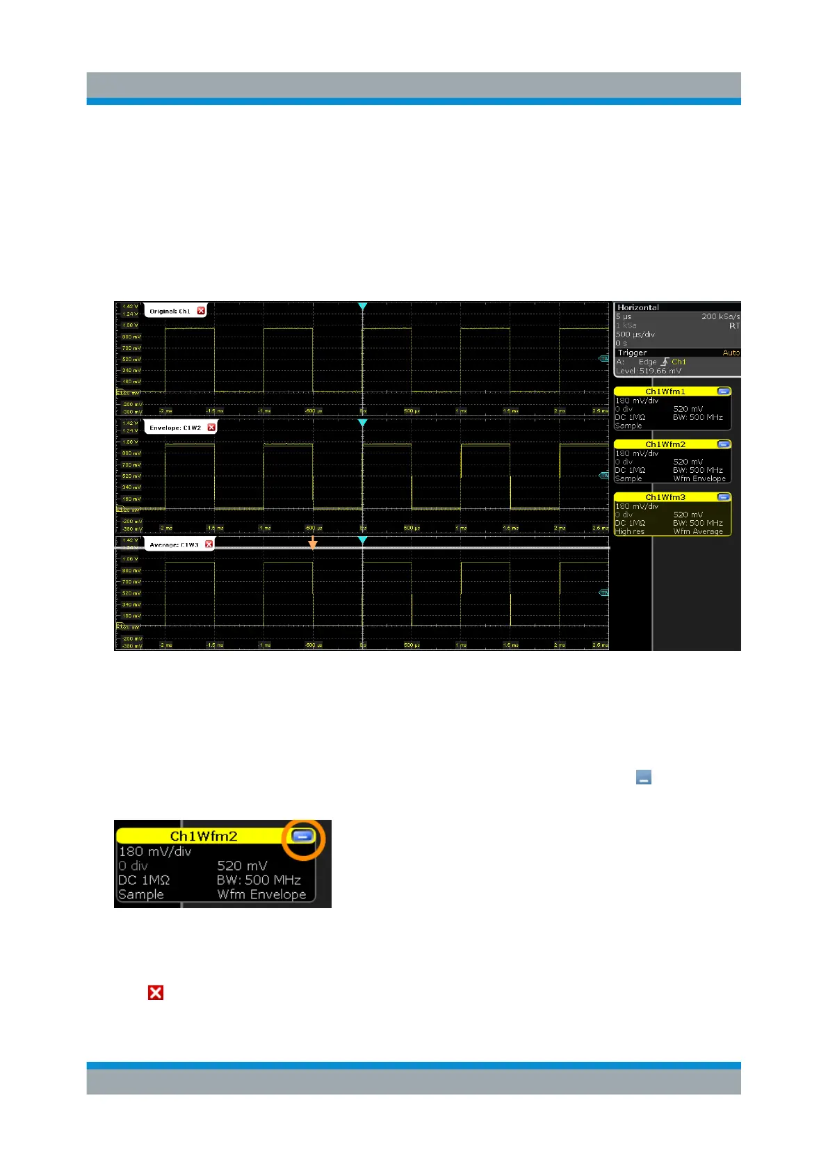 1. To minimize the waveform in diagram "Envelope: Ch1Wfm2", tap "Minimize"