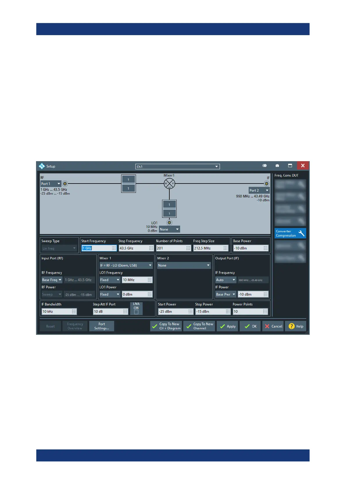 Access: Meas softtool > "Mixer Params" > "Gain Compression" > "Setup Frequency