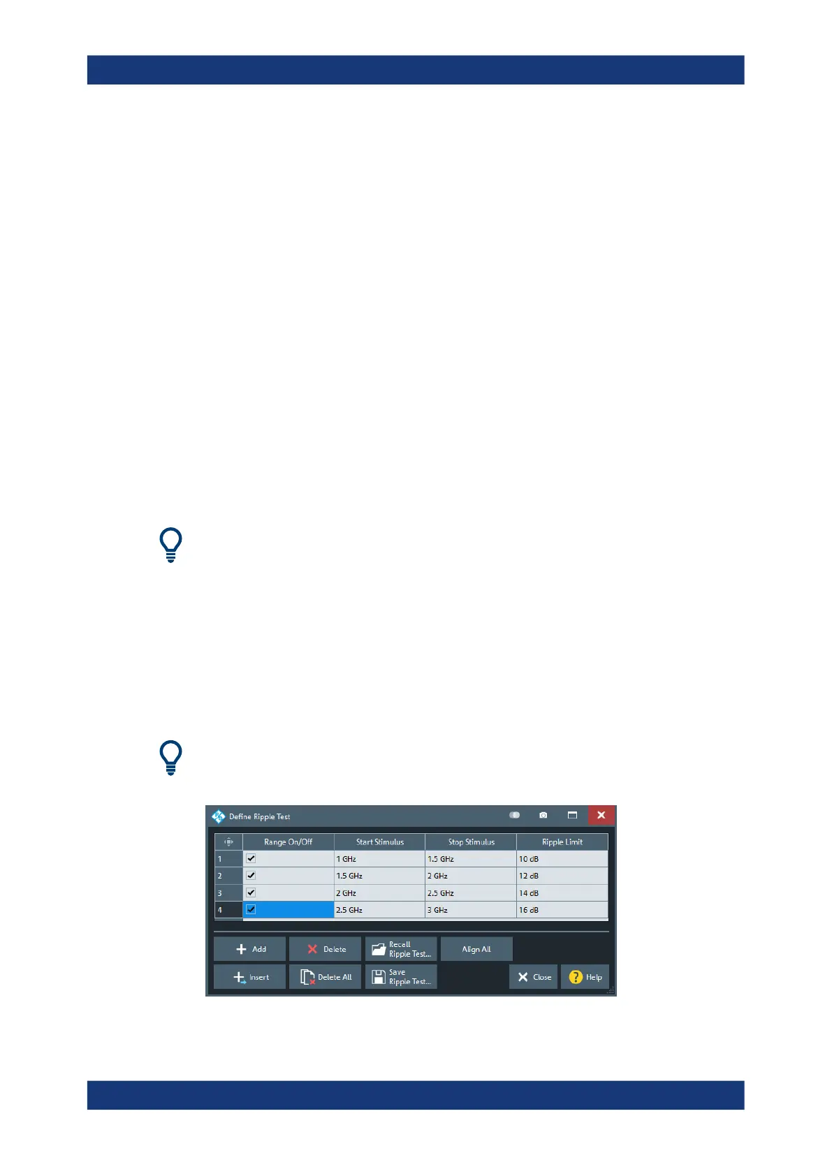 The "Define Ripple Test" dialog defines the ripple limits for the active trace on a range-