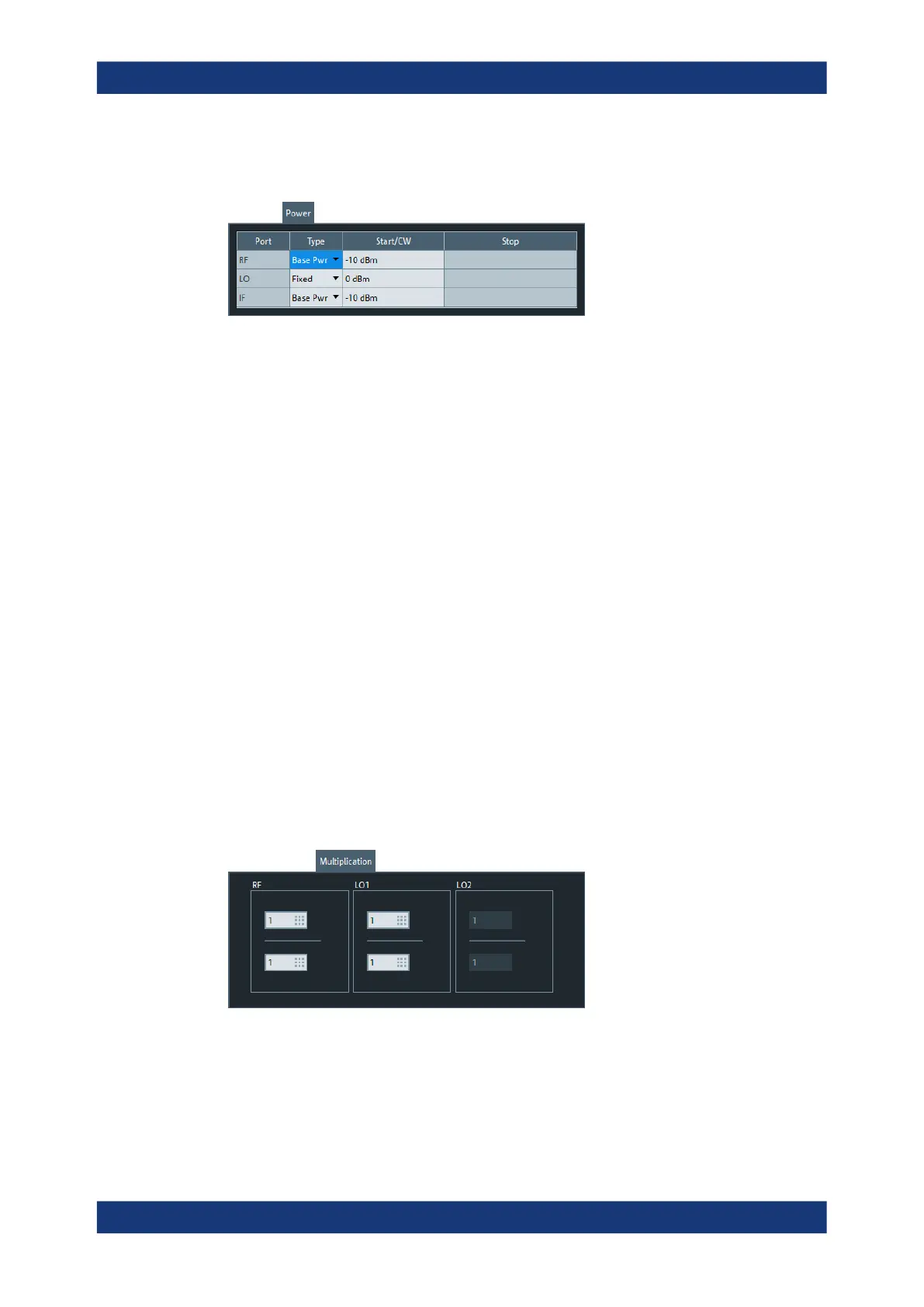 "Start/CW" defines the output powers at the RF, LO 1 and LO 2 ports. The "Base