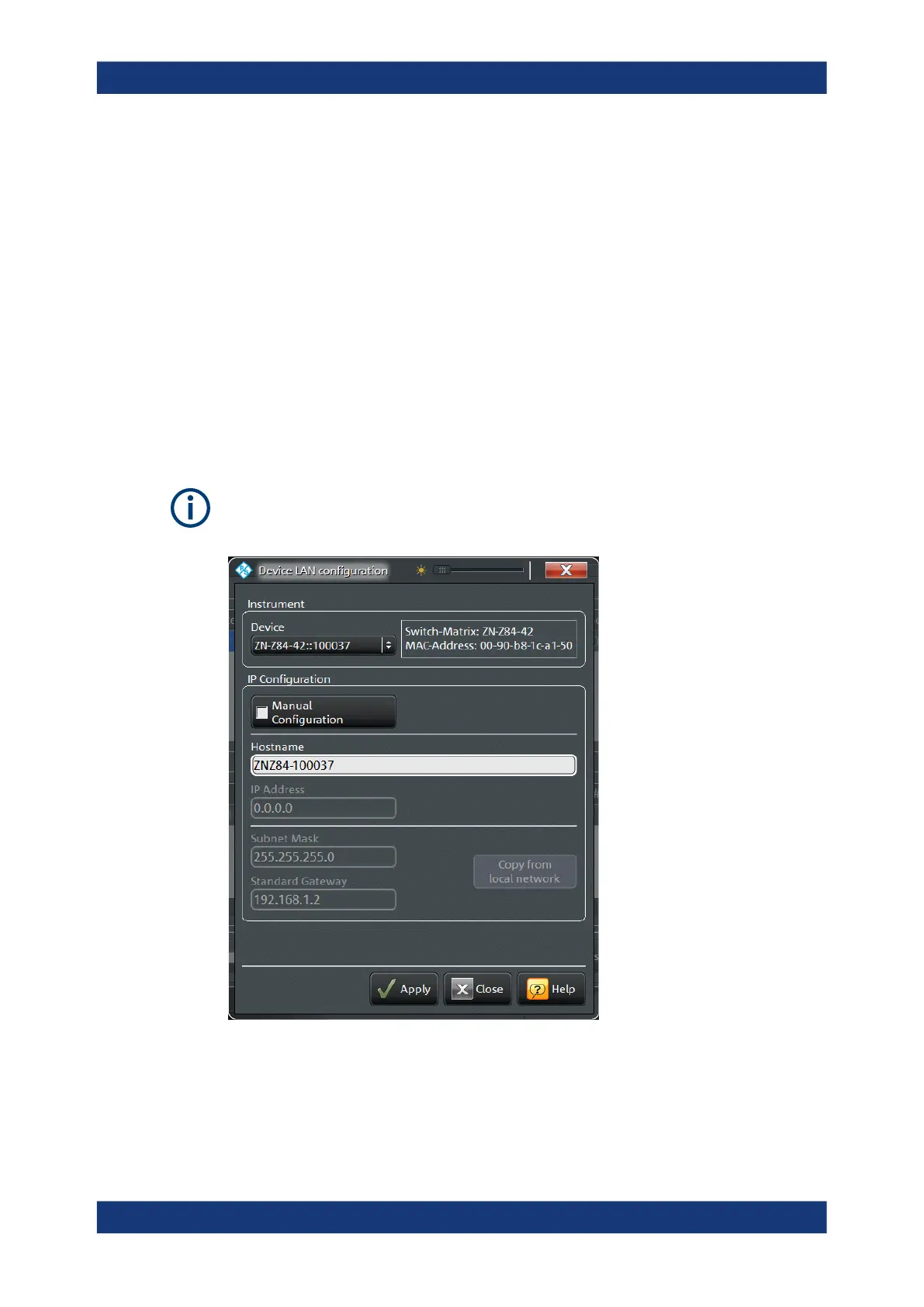 The "Device LAN Configuration" dialog allows to read and modify the "IP Configura-