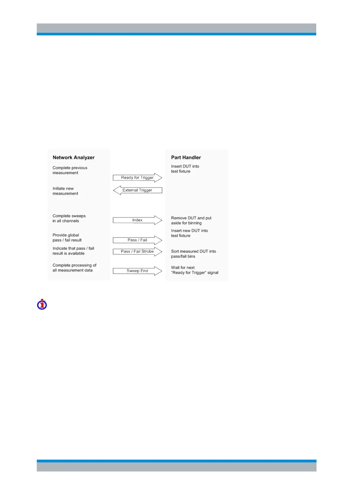 device to be tested into a test fixture, provide a trigger pulse to initiate the measurement, remove and