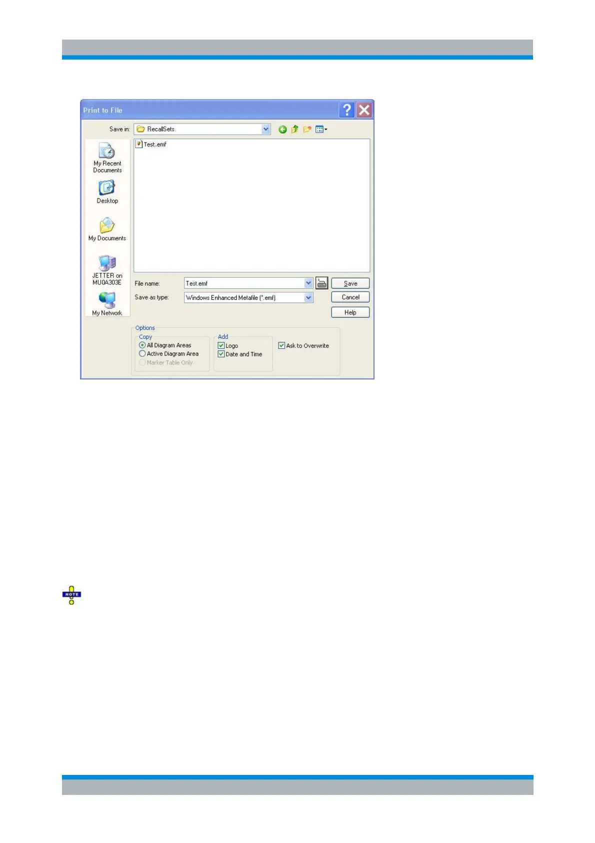 Save saves the screen contents in the selected file and directory and closes the dialog. The print